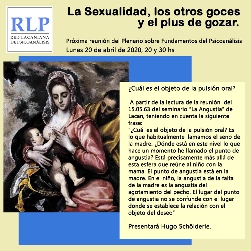 A partir de la lectura de la reunión del 15.05.63 del seminario “La Angustia” de Lacan, teniendo en cuenta la siguiente frase: “¿Cuál es el objeto de la pulsión oral? Es lo que habitualmente llamamos el seno de la madre. ¿Dónde está en este nivel lo que hace un momento he llamado el punto de angustia? Está precisamente más allá de esta esfera que reúne al niño con la mama. El punto de angustia está en la madre. En el niño, la angustia de la falta de la madre es la angustia del agotamiento del pecho. El lugar del punto de angustia no se confunde con el lugar donde se establece la relación con el objeto del deseo”