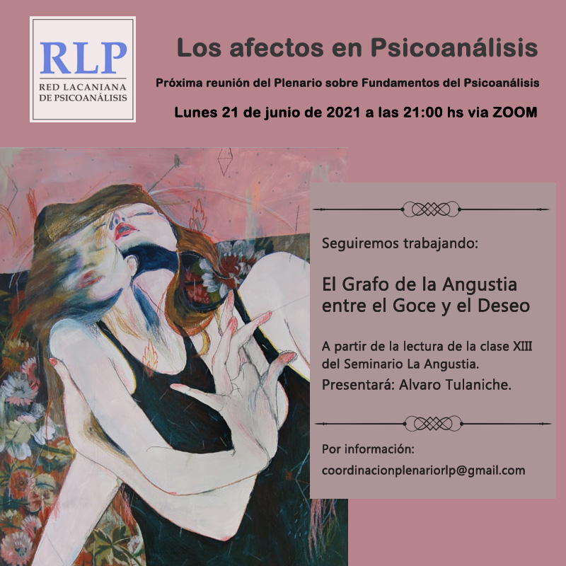 Continuando con nuestro estudio acerca de los Afectos en Psicoanálisis, seguiremos trabajando el Grafo de la Angustia entre el Goce y el Deseo a partir de la lectura de la clase XIII del Seminario La Angustia, que nos brindará Álvaro Tulaniche.